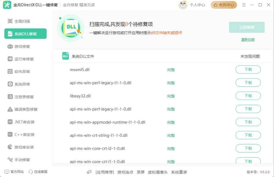 深入系统底层全面检测,精准识别组件错误与DLL依赖缺失提供修复方案。