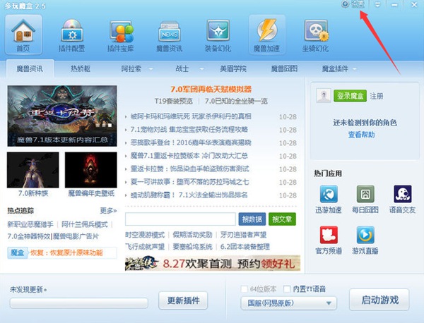 1、进入新手盒子魔兽世界软件当中之后点击右上角的设置按钮。