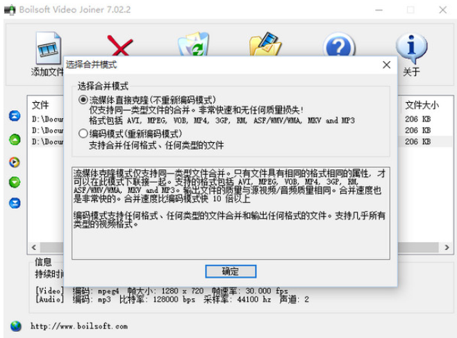 Boilsoft Video Joiner中文版是一个好用的视频合并软件,设置了两种合并模式,同一类型的视频格式可以直接用流媒体克隆,这样合并速度非常快,而且不会损坏视频质量,不同格式的视频就需要重新编码才能合并。