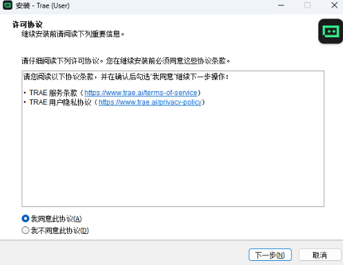 1、在本站下载trae中文版安装包,双击exe,勾选“已阅读协议”,点击下一步。