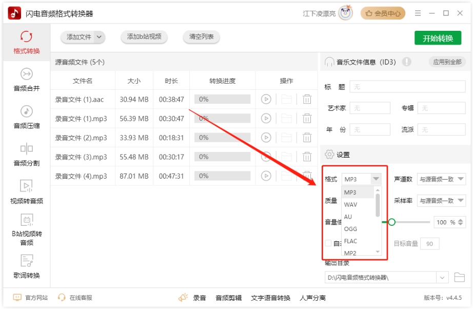 2、选择输出格式及参数,可自定义比特率采样率,或选用预设模式快速配置。
