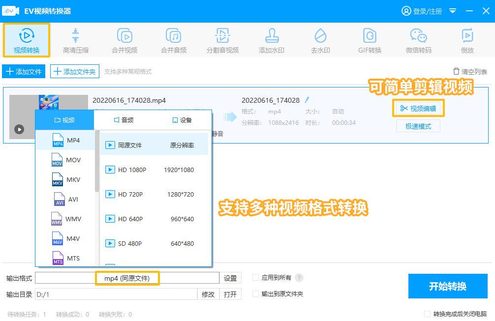ev视频转换器免费版是一款免费高效的视频处理工具,支持主流格式互转批量转换无损画质,适配多设备播放,无水印输出,免费享用核心功能一键完成任务,接下来就帮助大家了解ev视频转换器免费版的功能及使用方法。