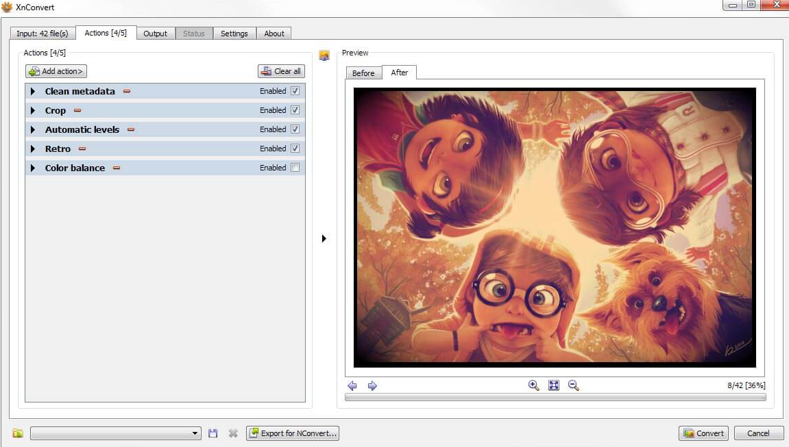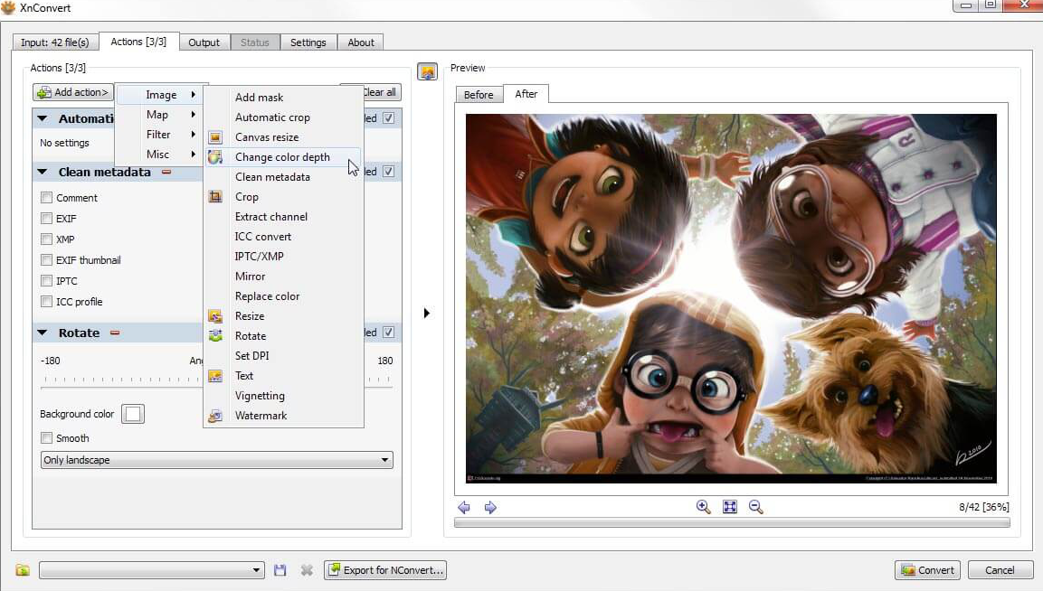 xnconvert绿色版是一款操作简便的专业图片批处理工具软件,软件界面简洁并支持多国语言包括中文,用户可通过拖拽方式添加图片,在动作面板中灵活配置处理步骤并保存为预设以便重复使用,特别适合摄影师、设计师和电商用户快速处理大量图片,下面一起来看看吧。