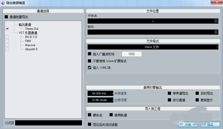 在导出窗口勾选“Channel Batch”,选择所有轨道,设置命名规则为“轨道名+序号”,一次输出多轨WAV。