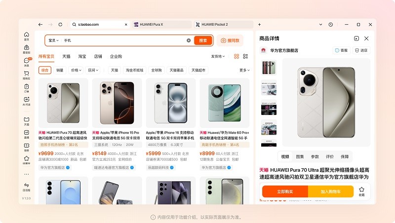 电脑淘宝桌面是阿里巴巴专门为PC买家打造的购物平台,功能基本上跟手机版差不多,但是电脑大屏看商品细节会更清爽,还能同时打开多个商品链接,这样就方便对比, 助力你买到性价比高的产品,购物狂们可以用用看。