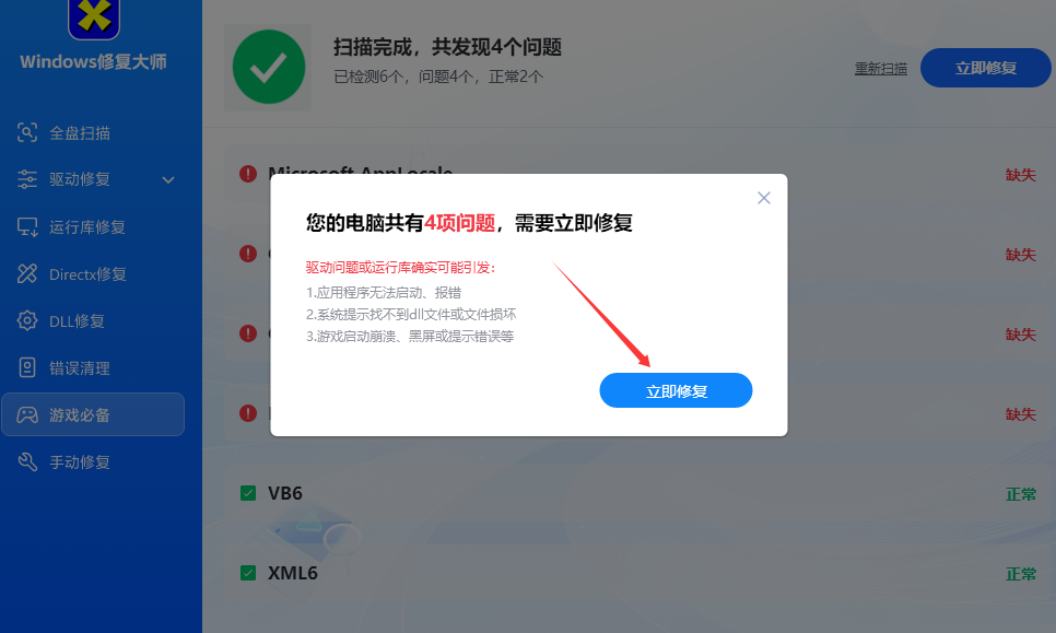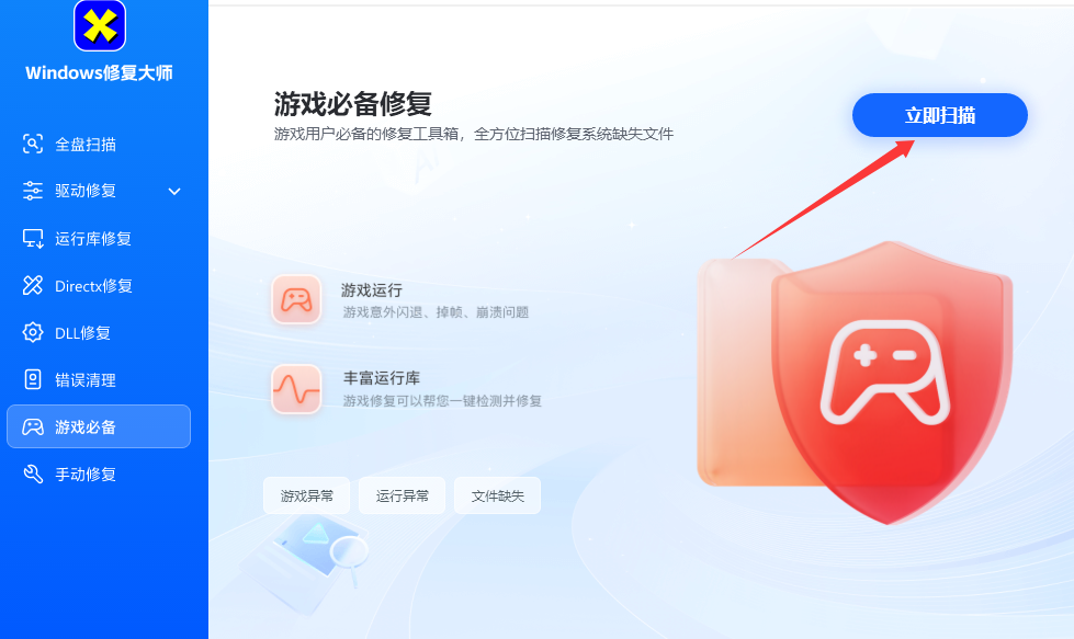 1、进入软件之后点击左边的游戏必备并对其进行扫描。