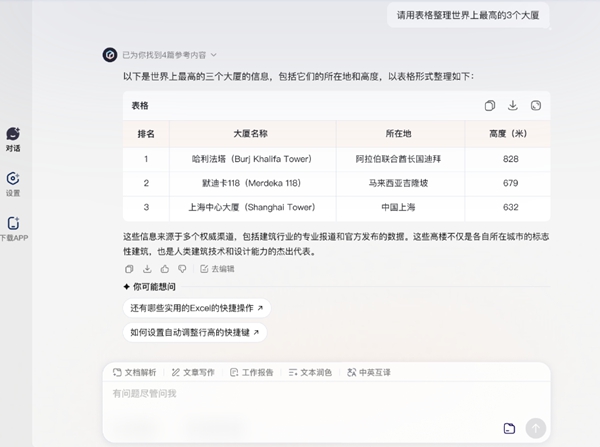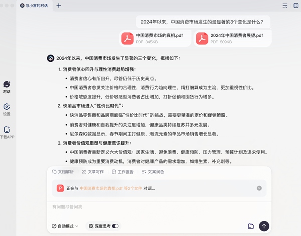 支持doc、pdf、ppt等十余种格式文档一键解析,可对文档内容进行总结、问答和校对,快速提取核心信息。