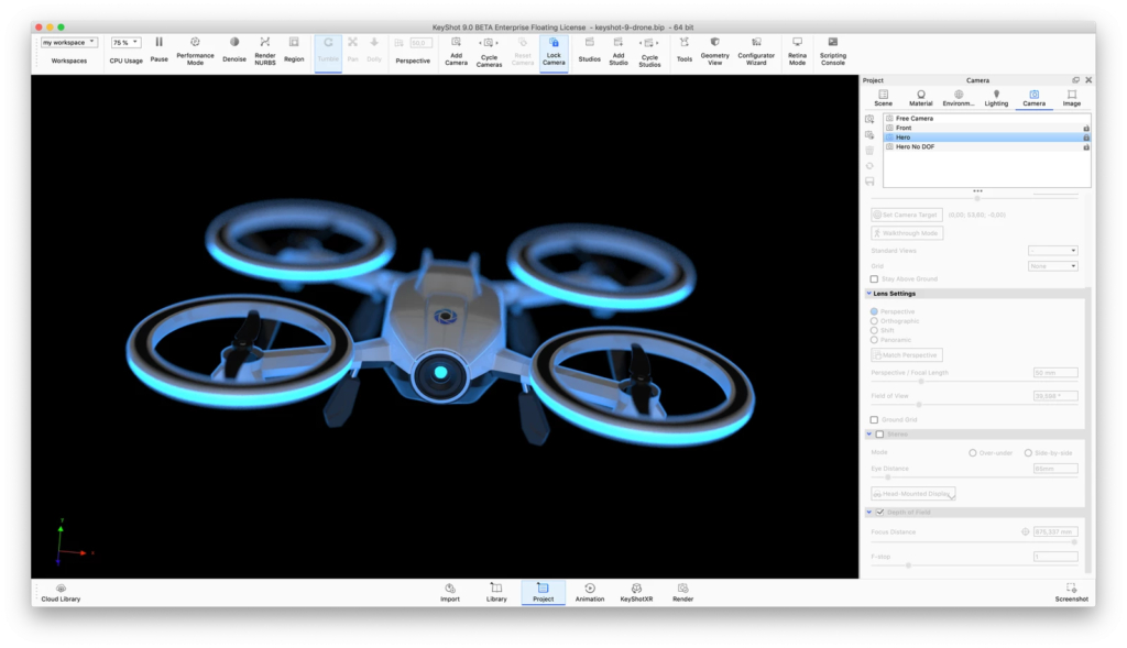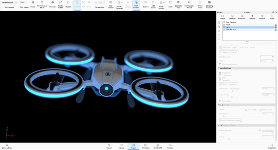 拖拽式场景搭建,支持模型导入与布局调整,背景虚化景深效果一键启用。
