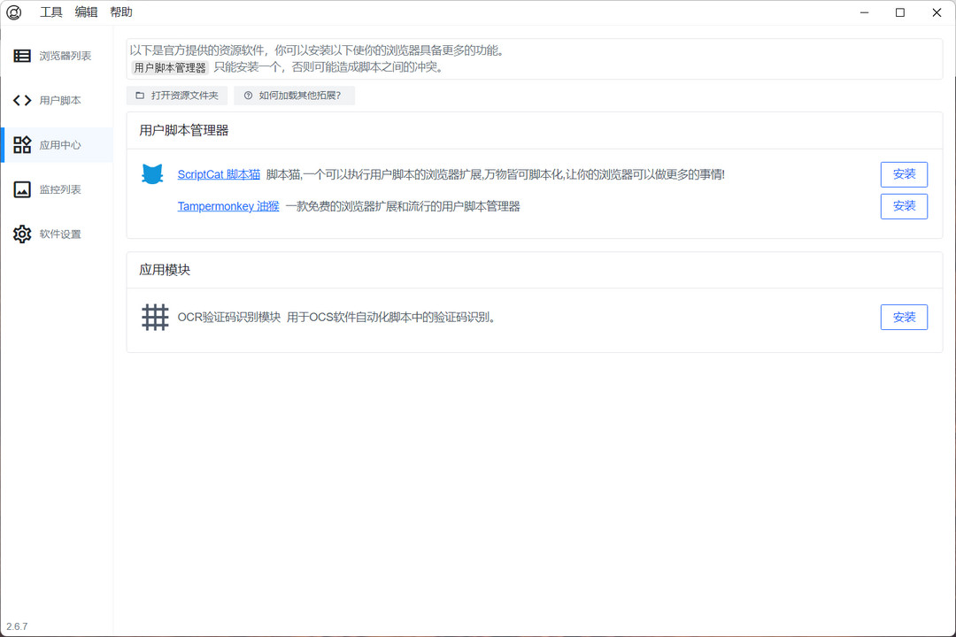 2、点击应用中心,可以安装用户脚本管理器。