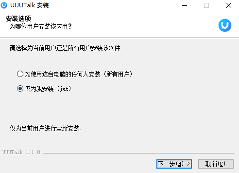 1、在本站下载并打开uuutalk聊天软件正版的安装包,之后点击为我安装,进行下一步。