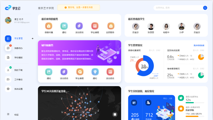 学生可在线提交请假申请,审批流程可自定义,并支持定位销假功能。