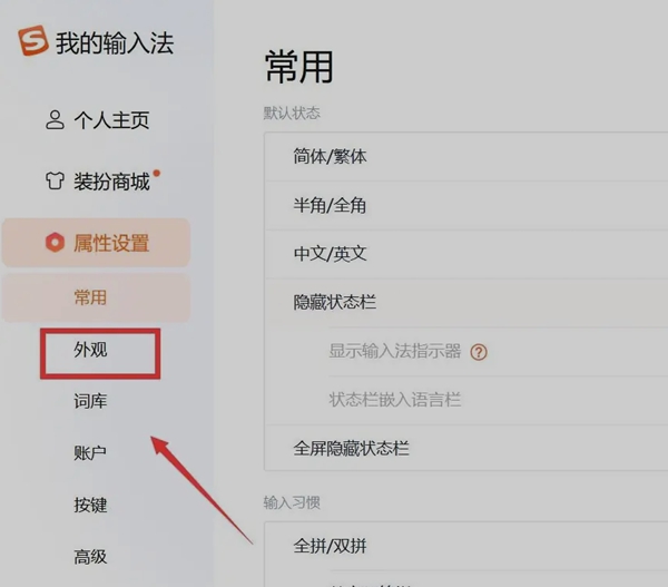 2、接着在左侧边栏点击属性设置中的【外观】设置选项。