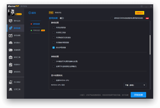 1、通过内存整理、清理进程、优化电源等方案,一键优化游戏加速。