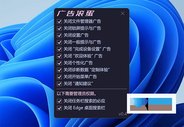 OFGB禁用windows11内置广告可以让系统界面回归之前干净的模样,通过修改系统注册表,将win11中的大量内置广告给屏蔽掉,从源头进行阻断,这样在使用的时候再也不会看到广告弹窗了,大家可以安心上网。