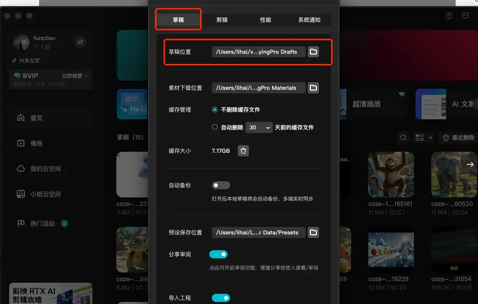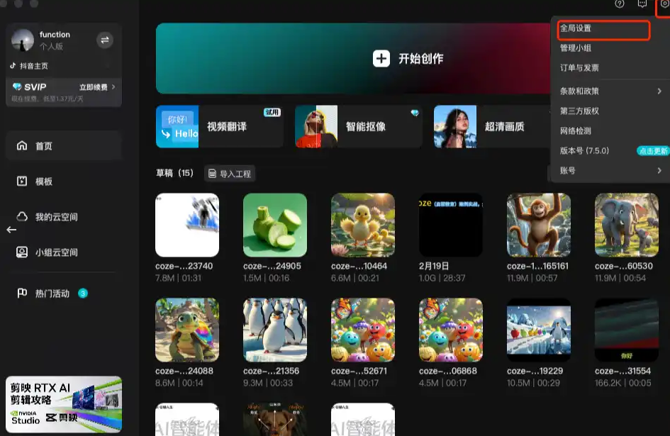 1、进入剪映当中点击右上角的全局设置。