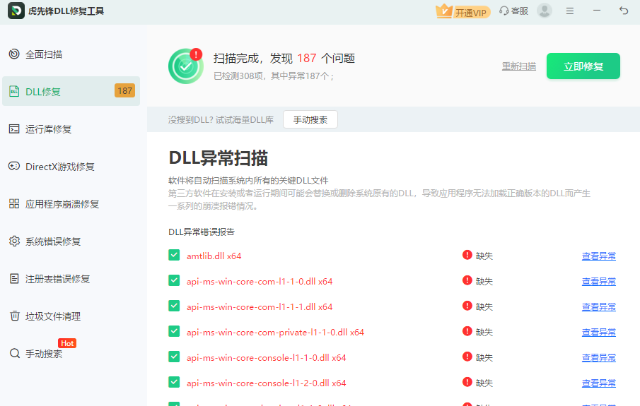dll修复工具虎先锋directx dll修复工具是一款免费DLL修复工具软件,它主要功能是自动检测并修复Windows系统中因DLL文件缺失、损坏或版本冲突导致的程序运行问题,帮助用户解决软件打不开、游戏崩溃等常见错误,下面一起来看看吧。