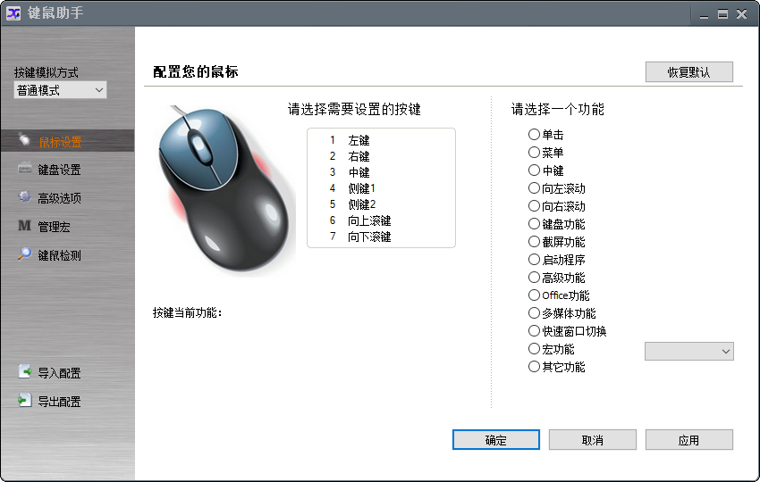 允许将键盘特定按键设置为鼠标左右键功能,实现按键功能灵活替换。
