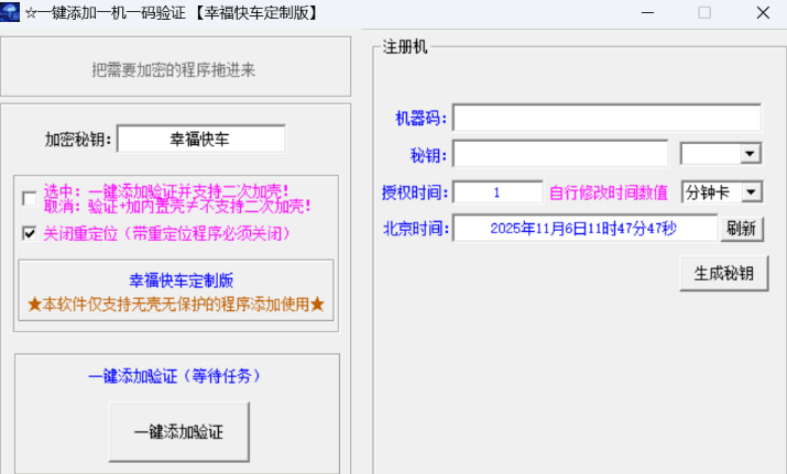 一键添加一机一码验证是一款专门用来加密应用的工具,用户可以通过该软件来将一些无壳的应用添加上密码。软件内置详细的使用方式和注意事项,辅助用户快速上手。还可以使用软件来生成机器码和密钥,十分好用。
