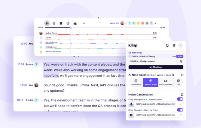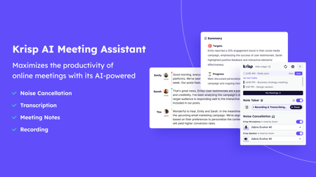 krisp是一款非常强大的AI会议助手,这款软件当中不仅仅可以实现在线化的会议交流,还能够在软件当中实现会议的录制以及对话降噪等,可以在多种不同的办公场合当中都能够借助其功能提升自己的办公效率。