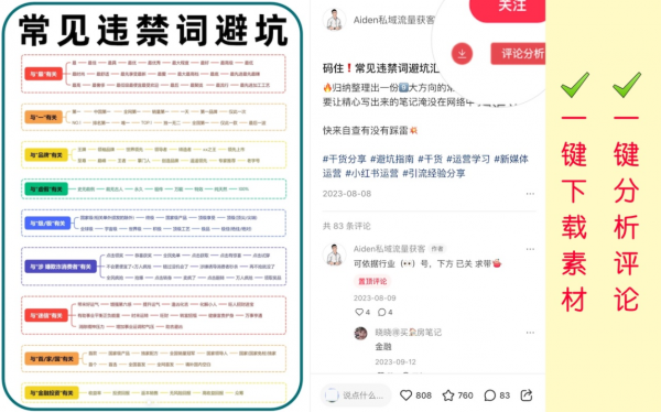 2、违禁词检测:自动识别违规词汇,避免账号限流,确保笔记不会被和谐。