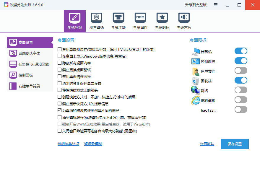 提供了对桌面外观的调整功能,提供了非常丰富的调整选项,可以轻松进行设置处理。