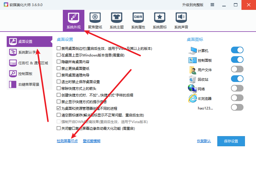 1、打开软件,进入系统外观的桌面设置,点击下方的检测屏幕坏点。
