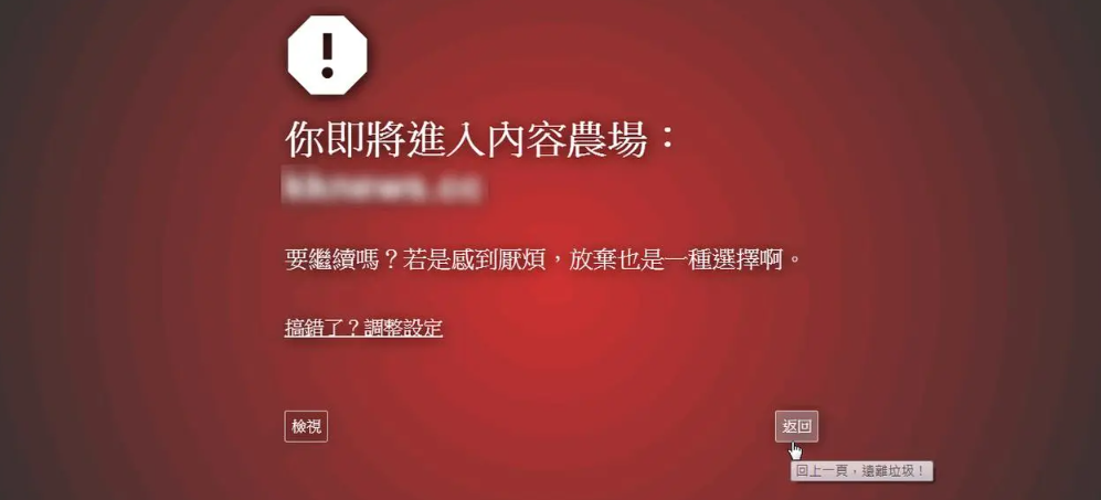2、实时封锁:就算不小心点击了内容农场的文章也不用担心,插件会在进入之前封锁。