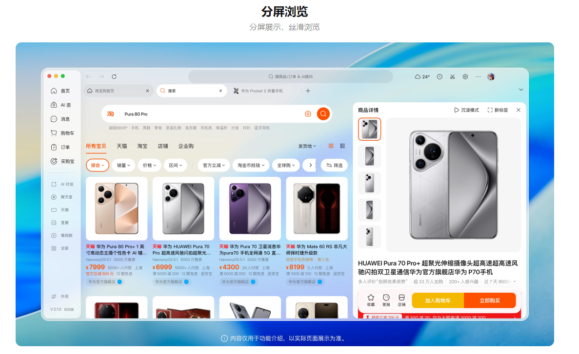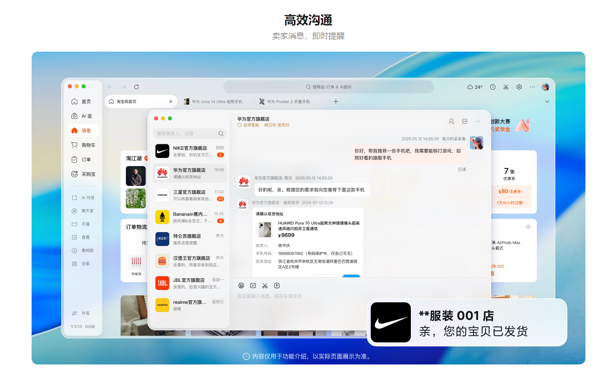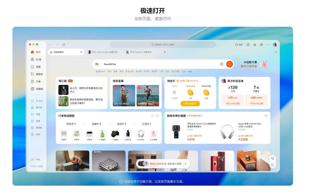 ❶ 新增超级地址栏 ,同一个输入框支持商品和店铺搜索、已买到宝贝搜索、购物车搜索、AI对话、企业采购需求输入和网址输入;