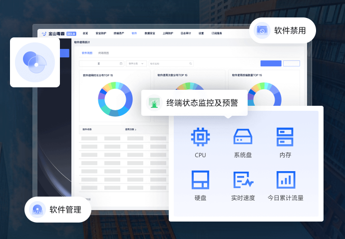 2、禁用某些软件,监控终端状态,发现异常会触发预警。