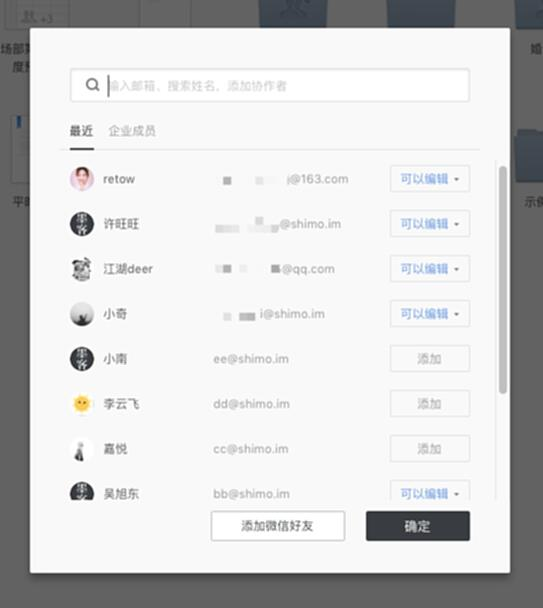 3、输入邮箱、姓名来找人,或者添加微信好友,把对方拉进来后就可以共享文件了。