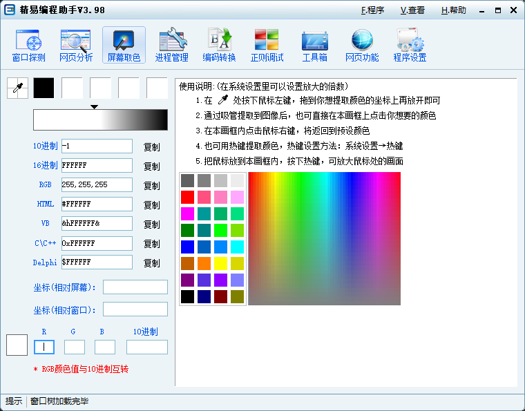 集成了网页分析、窗口探测、编码转换、屏幕取色等数十种实用功能。