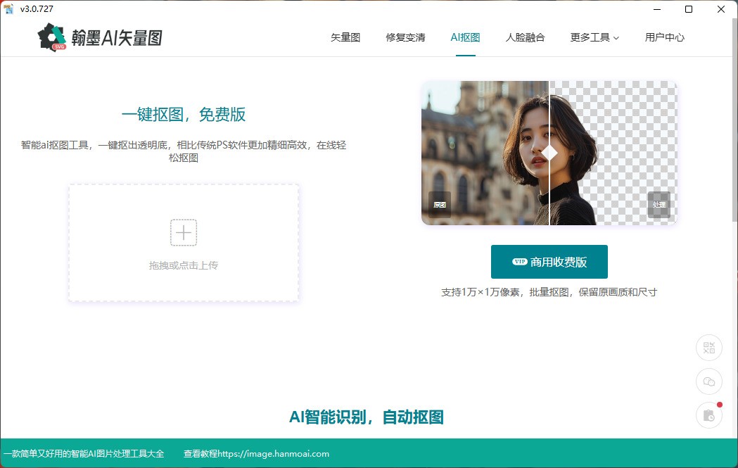 翰墨AI矢量图转换器免费是一个非常好用的修图工具,全程都由AI来解决,从修复模糊图片,抠出主体目标,再到转化为高清矢量图,期间都不需要我们操心,AI会负责好一切的,而且处理起来又快又好,比起手动一点点修图厉害多了。