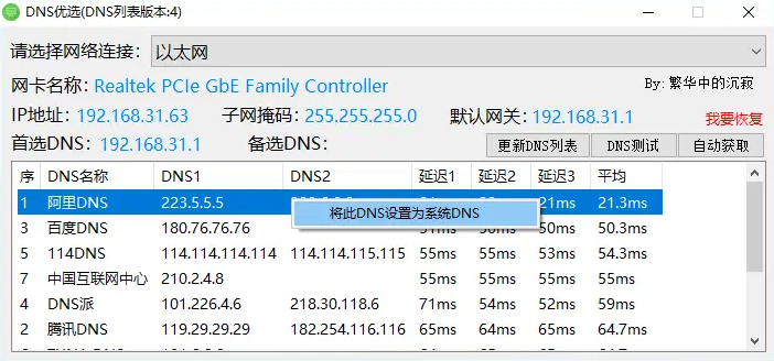 DNS优选软件是一款十分优质的dns查询软件,该软件会自动对电脑进行检测,然后将dns相关的信息全部都显示出来。此外还提供一键更改dns的功能,通过更改的方式来解决跳转广告等莫名页面的问题,还能随时恢复。