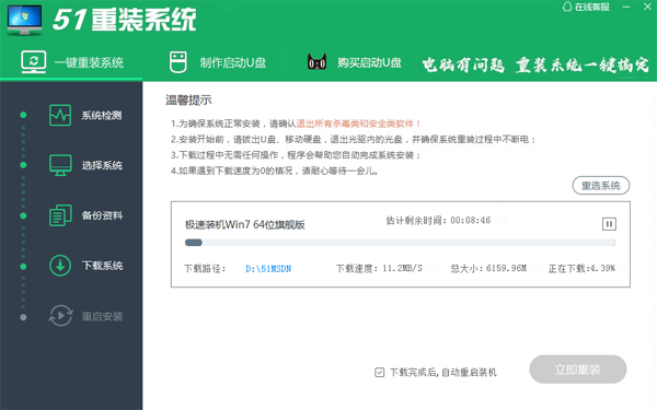 2、按提示勾选安装选项,等待系统自动下载与重装进程完成。