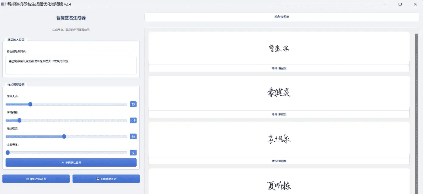 智能签名生成器是一款轻量便捷的签名生成软件,用户只要输入名字即可让软件来生成对应的签名了。用户能自行选择想使用的签名并将其下载下来,这样就能运用到PDF或者其他文档上了。软件自由度高,能满足用户需求。