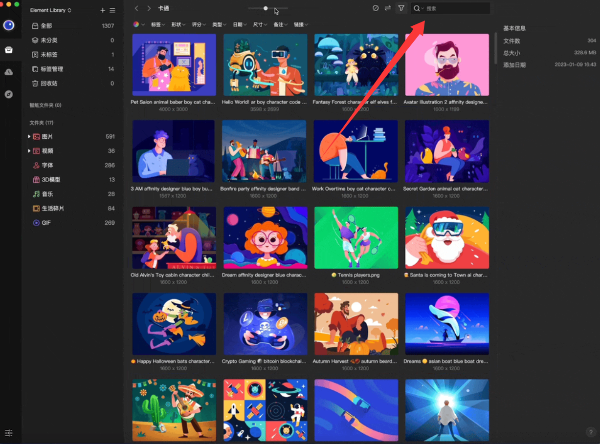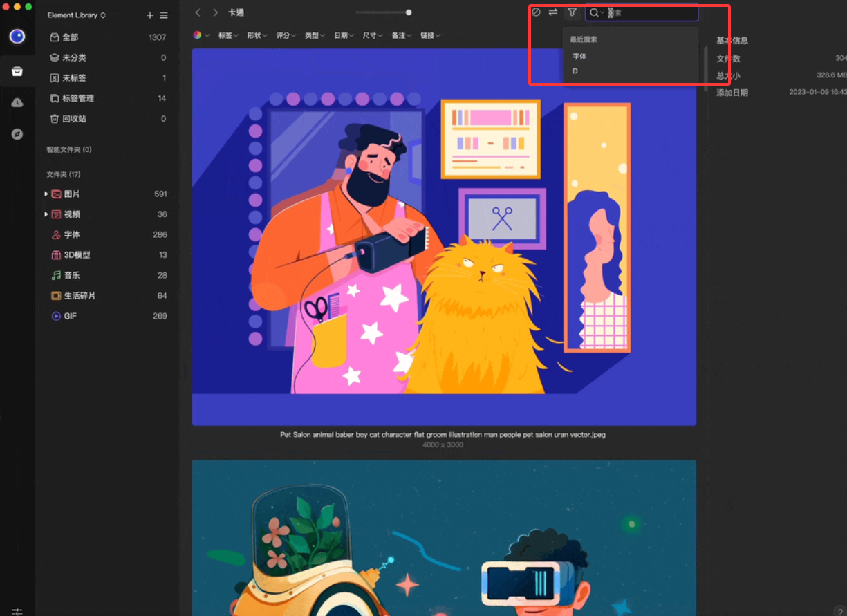 4、搜索查询:输入关键词即可快速查询对应的素材了,还支持设置一个过滤规则只显示重要素材。