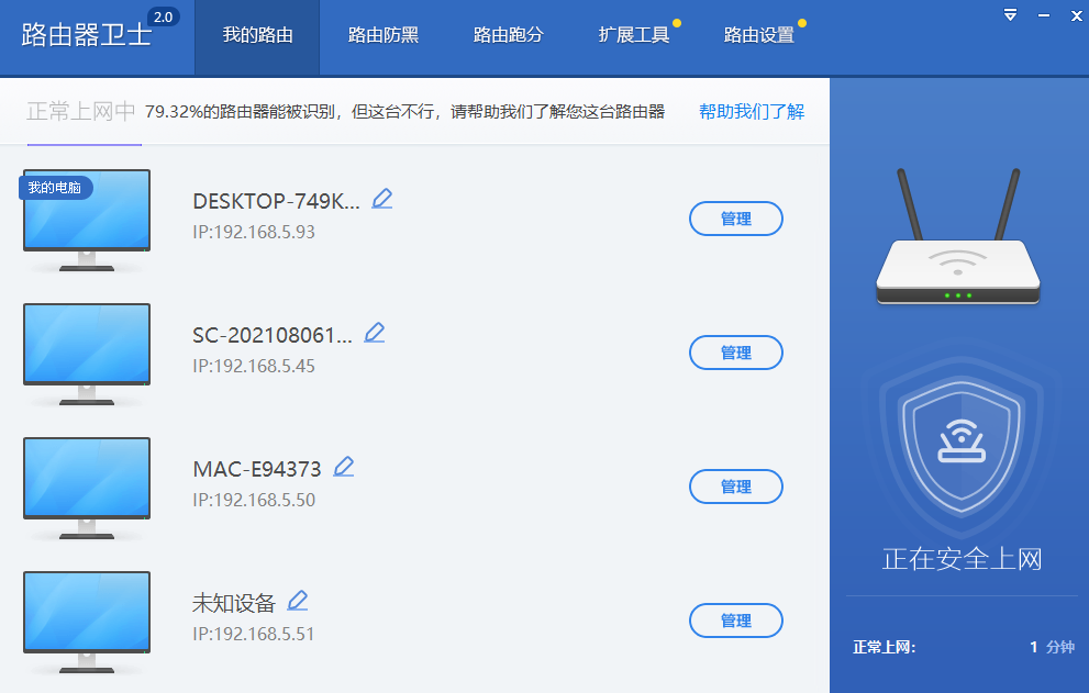 360路由器卫士防蹭网是360公司推出的家庭网络安全管理软件,它支持市面上大多数品牌型号的路由器,不需要专业网络知识就可以管控了,时刻守护家庭网络安全,防止病毒入侵,也能阻挡邻居们蹭网,这样就不用担心网速会变慢了。