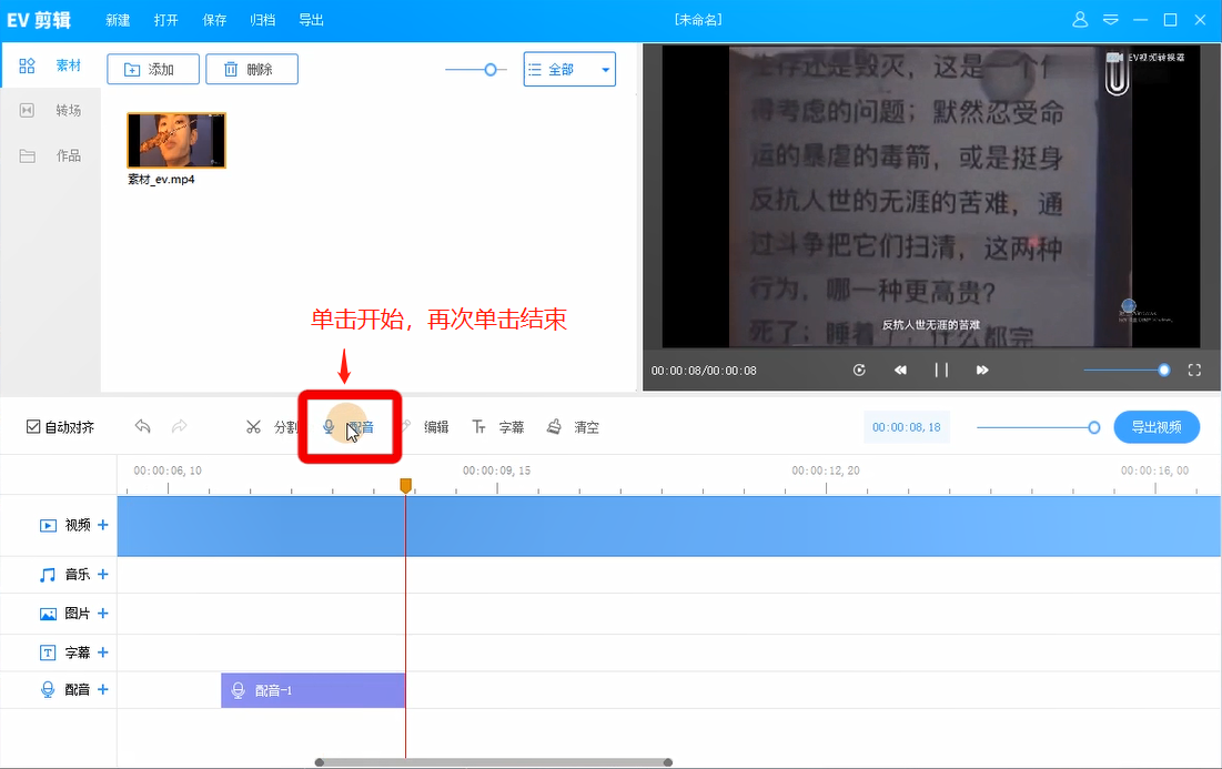 3、点击配音功能,这样你就可以配音了,再点击一下就结束配音。